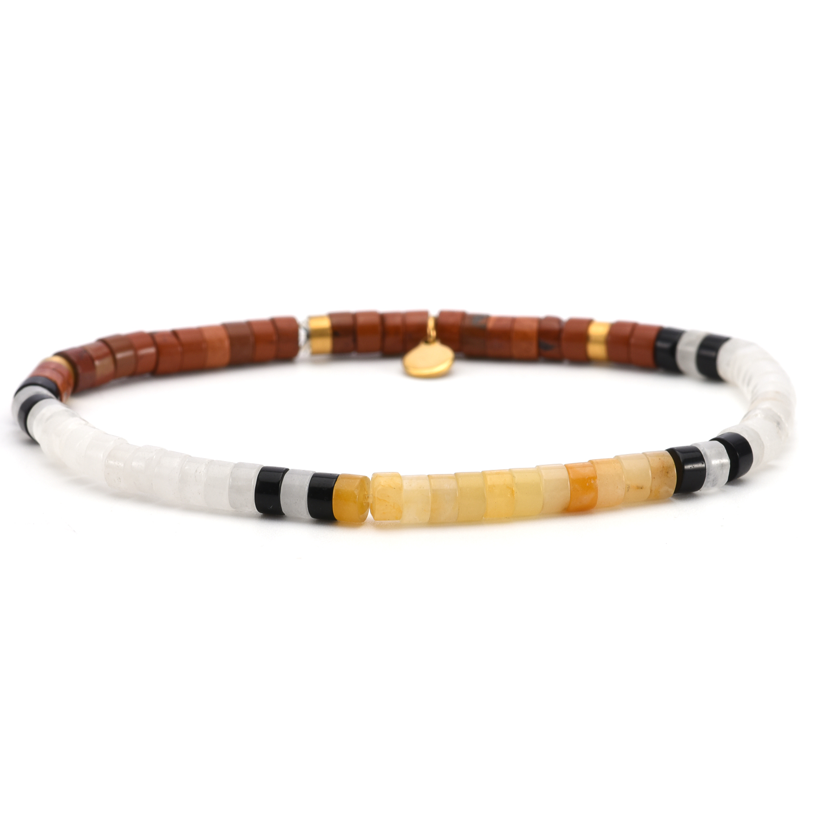 Les perles de jaspe blanche, jaune et rouge qui composent ce bracelet ne sont pas seulement esthétiques, elles possèdent également des vertus apaisantes et énergisantes. Le jaspe est une pierre naturelle réputée pour ses propriétés de protection et d’harmonisation des énergies. En portant ce bracelet, vous bénéficierez donc non seulement d’un accessoire tendance, mais aussi d’un véritable allié pour votre bien-être au quotidien.