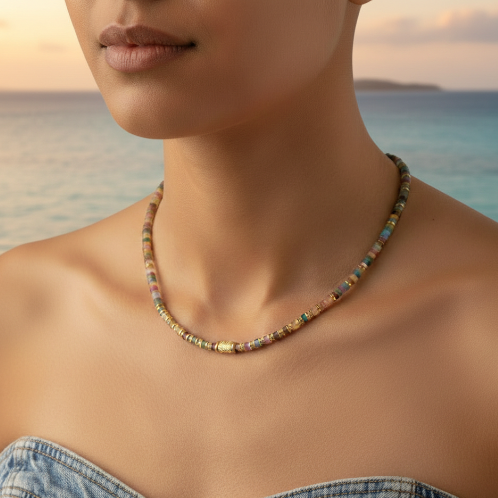 A chakra necklace with heishi tiger eye beads for balanced energy