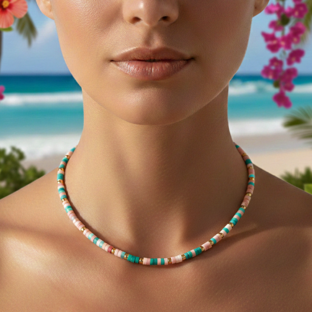 Collier 4mm perles heishi turquoise verte quartz blanc